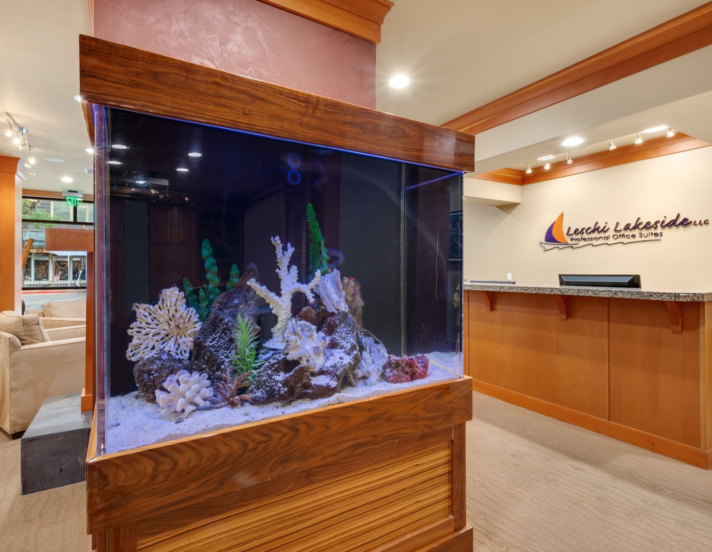 Leschi Lakeside Professional Office Suites is made up of 14 high-end professional office suites along with a lobby area, conference room, bathrooms, kitchenette, and parking garage. You will find gallery quality artwork hung throughout the 5,126 square feet of office space as well as an aquarium, coffee/tea nook, beautiful planter boxes, mail/package area, and high-end touches all throughout the space. Management works on-site, so the space is always kept up/cleaned and mail and packages are always sorted.