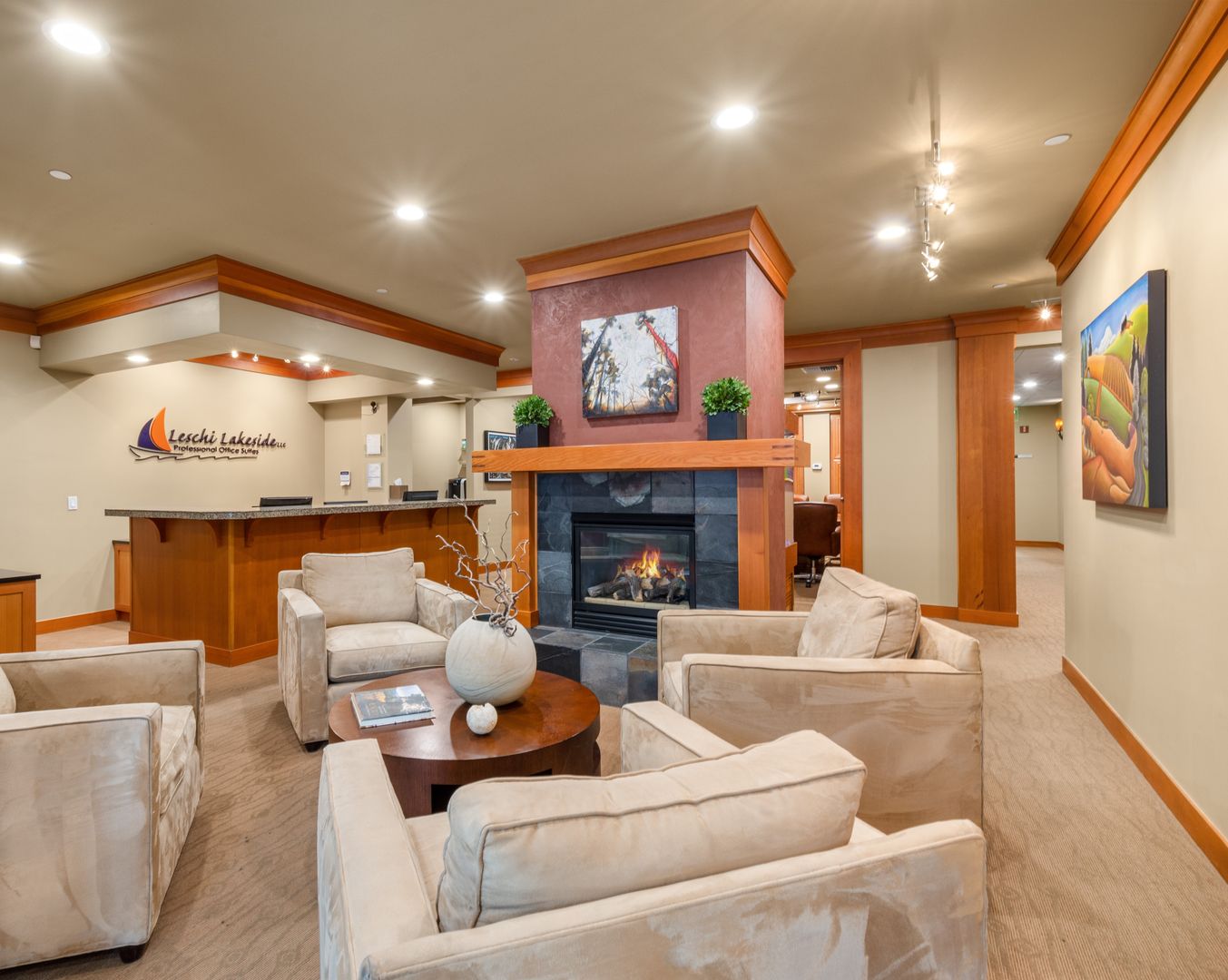 Leschi Lakeside Professional Office Suites is made up of 14 high-end professional office suites along with a lobby area, conference room, bathrooms, kitchenette, and parking garage. You will find gallery quality artwork hung throughout the 5,126 square feet of office space as well as an aquarium, coffee/tea nook, beautiful planter boxes, mail/package area, and high-end touches all throughout the space. Management works on-site, so the space is always kept up/cleaned and mail and packages are always sorted.